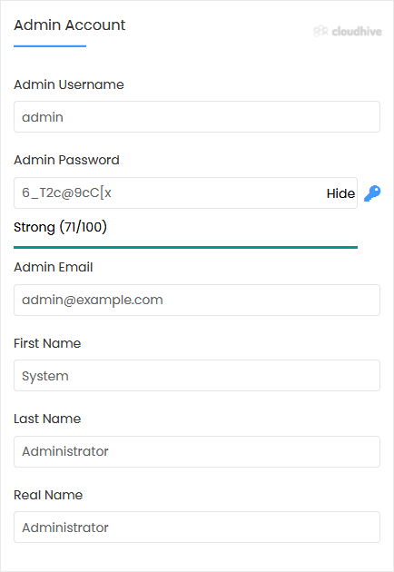 7. Under the Admin Account section, enter the following information: